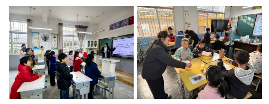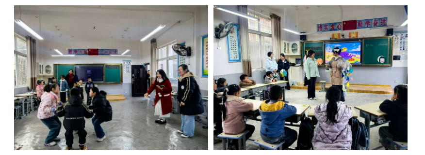 本次活动以“增进情感联结、精准优化教学、推动交流共进、强化实践育人”为宗旨,着力构建“线上高频互动+线下场景浸润”的教育闭环。教育学院心弦支教队为一至三年级学生带来趣味音乐游戏,科启新苗支教队为四至六年级学生开展生动的科学实验演示;文传学院烛光支教队以“音乐绘本剧”形式带领一年级孩子们共同演绎音乐绘本剧,将绘本中蕴含的品格道理悄然植入童心;外语学院彩虹桥支教队则用节奏明快的英语律动让孩子们在拍手、跳跃与欢笑中勇敢开口。各队还进行了学生表彰仪式与课程质量调查反馈问卷收集,切实做到“教有回应、学有激励”。